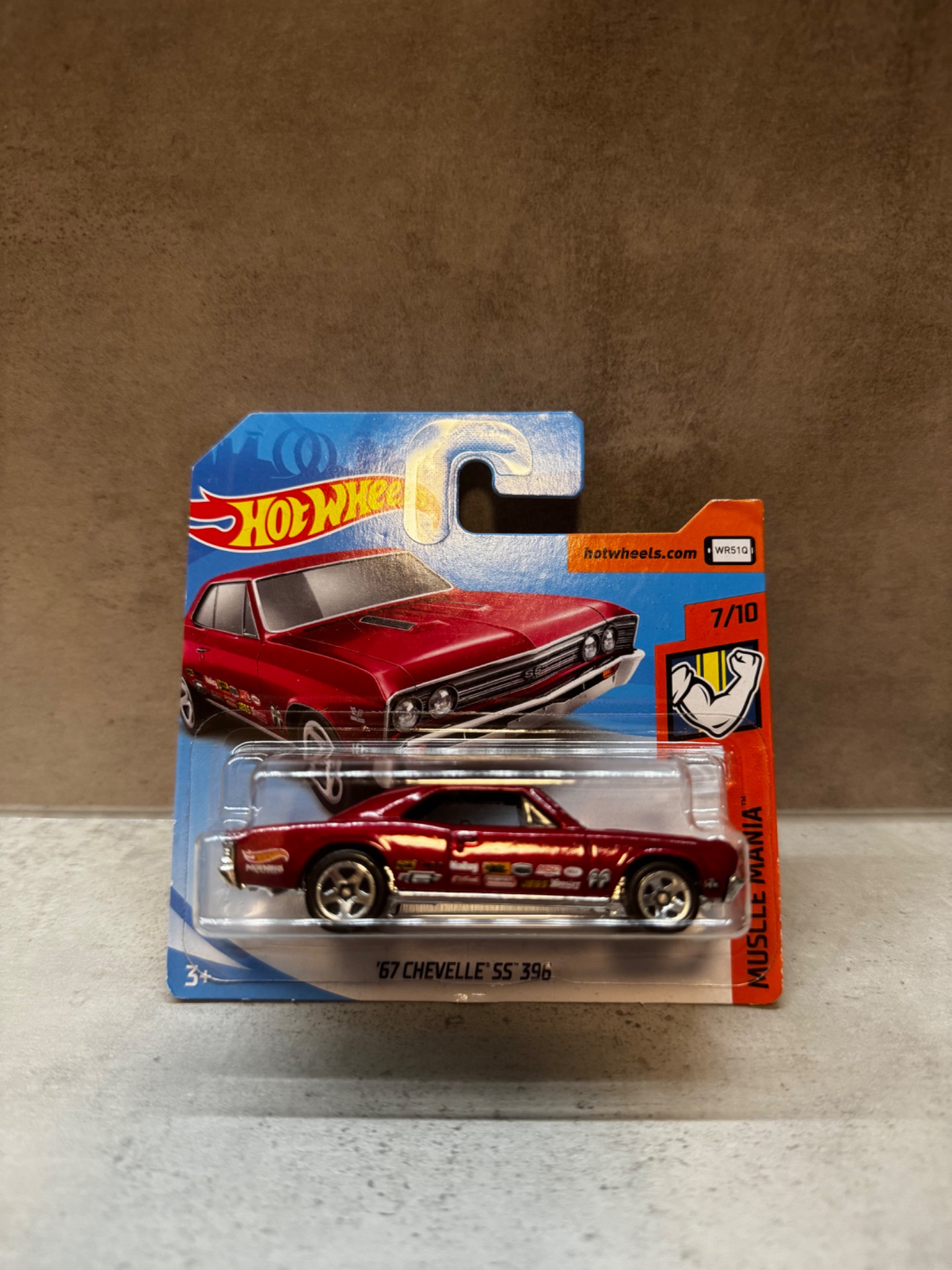 Ikonický americký muscle car '67 Chevrolet Chevelle SS 396 v sérii Hot Wheels Muscle Mania. Model v temně červeném laku doplněný závodními sponzorskými potisky a chromovanými detaily krásně vystihuje drsný charakter klasických dragsterů 60. let.