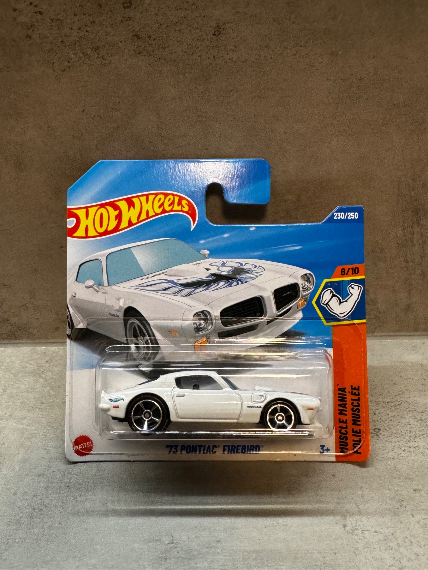 Klasický americký muscle car Pontiac Firebird 1973 v bílé barvě s modrým motivem na kapotě. Skvělá volba pro fanoušky Muscle Mania a amerických ikon.