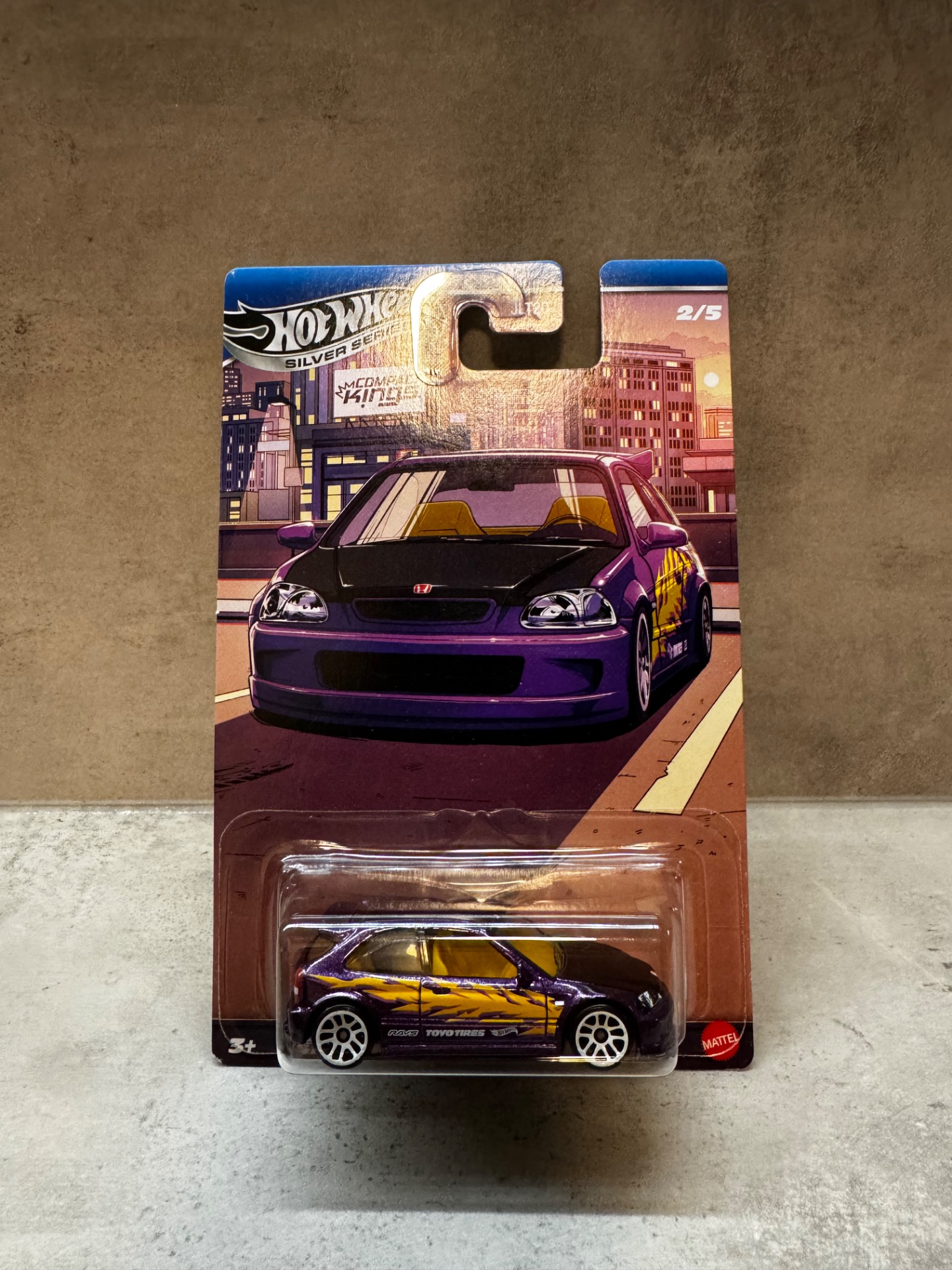 Stylový Honda Civic v úpravě ze série Hot Wheels Silver Series. Výrazná grafika, tuningový vzhled a sběratelské balení dělají z tohoto modelu atraktivní kousek pro fanoušky JDM kultury a upravených aut.