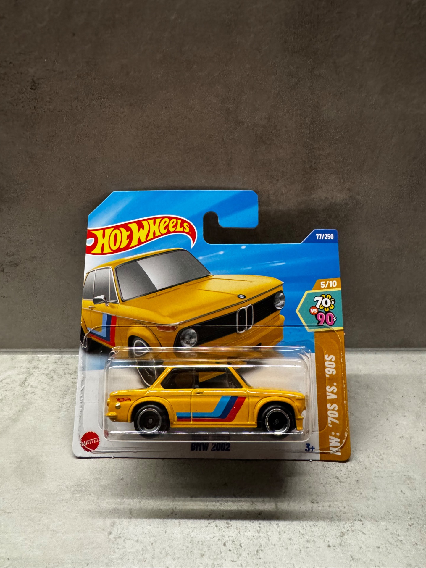 Klasická legenda mezi sportovními vozy — BMW 2002 v ikonické žluté barvě s retro M-stripe grafikou. Model ze série 70s vs 90s připomíná zlatou éru evropských sportovních sedanů a patří mezi vyhledávané kousky každého sběratele.