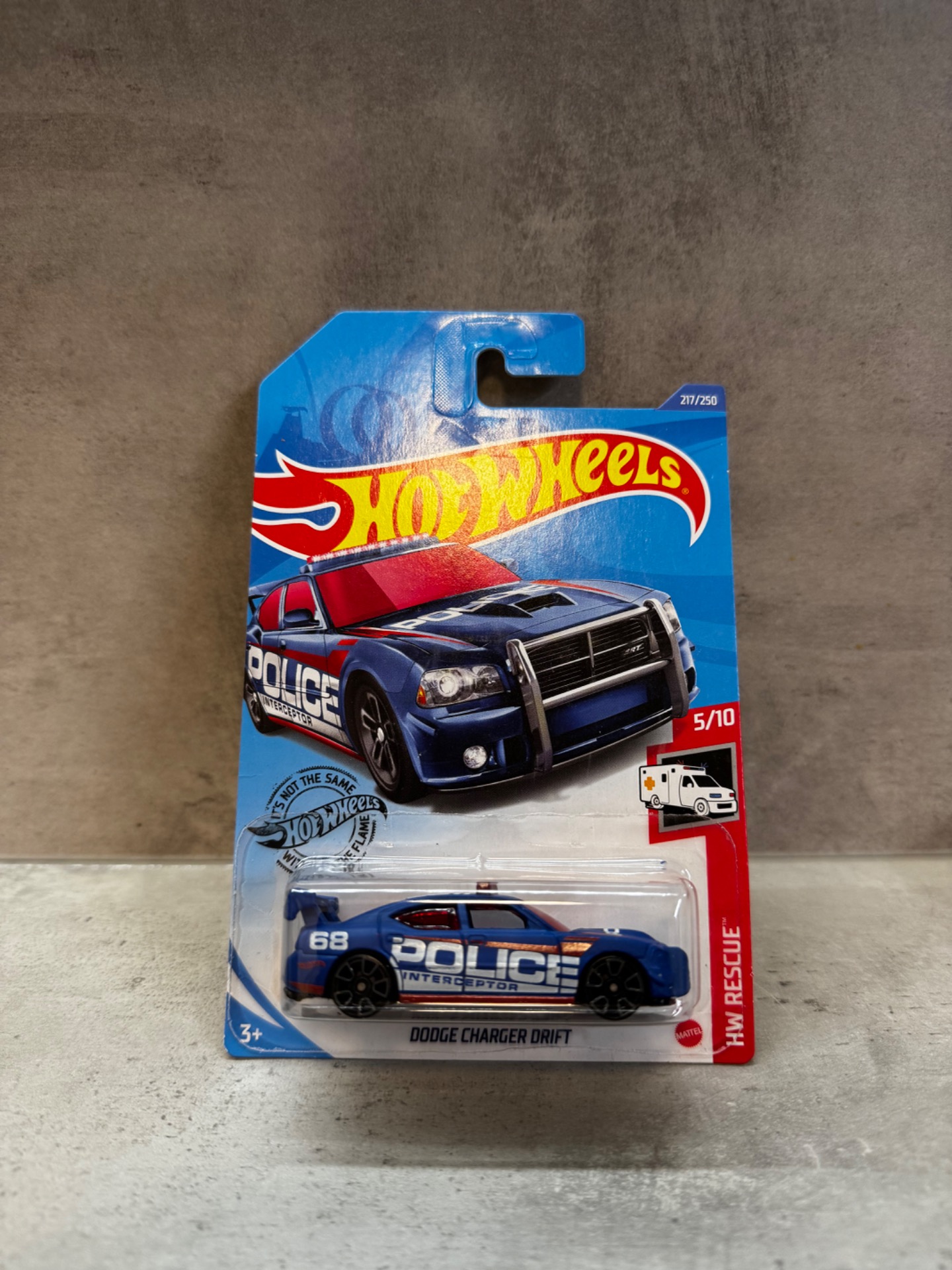 Policejní Dodge Charger Drift v akčním provedení Hot Wheels. Výrazná grafika a agresivní postoj dělají z tohoto modelu ideální kousek pro fanoušky akčních aut a policejních sbírek.