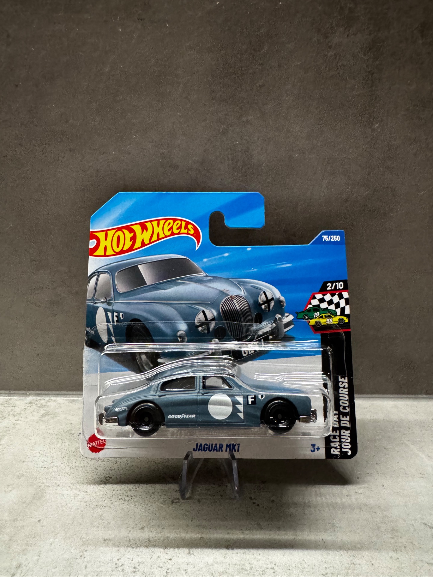 Model klasického britského vozu Jaguar MK1 od značky Hot Wheels v měřítku 1:64. Tento automobil patří mezi legendární závodní vozy 50. let, které se proslavily v evropských okruhových závodech.