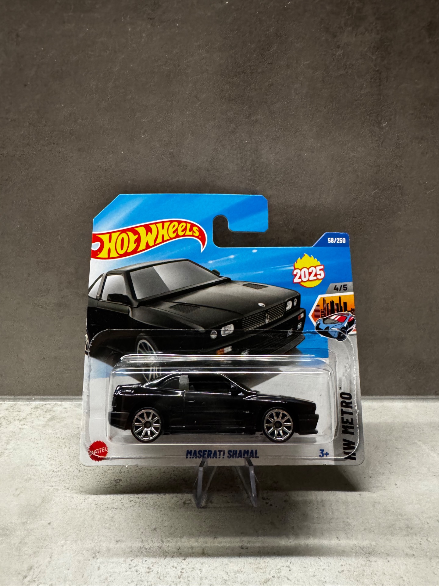 Model luxusního sportovního vozu Maserati Shamal od značky Hot Wheels v měřítku 1:64. Tento ikonický automobil z 90. let patří mezi raritnější modely značky Maserati.