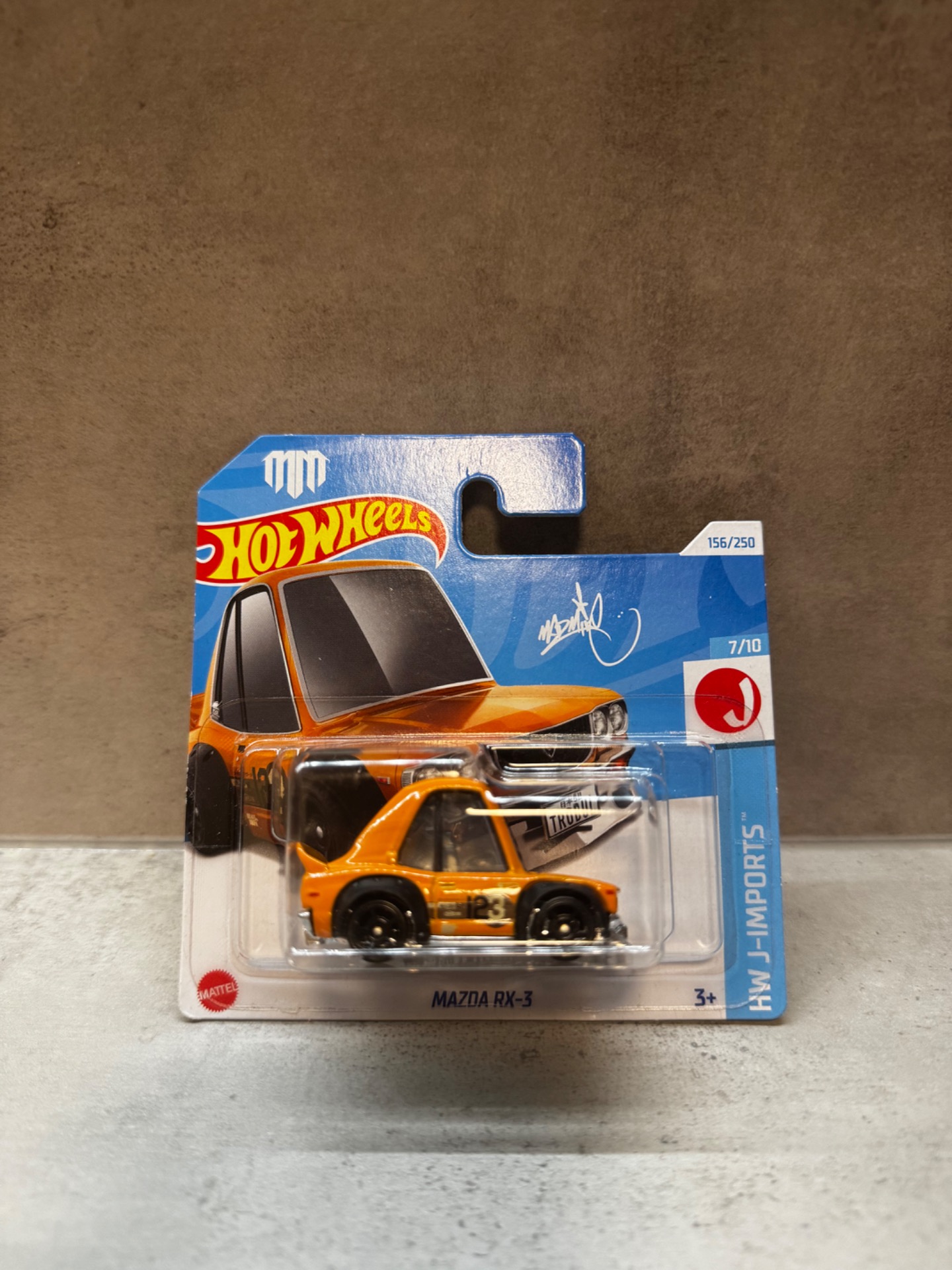 Mazda RX-3 v populární "Tooned" stylizaci, inspirovaná závodní estetikou japonských 70. let. Výrazný oranžový lak s číslem #123, široké blatníky a typická karikovaná silueta dodávají modelu unikátní sběratelský charakter. Skvělý kousek do tematických JDM a HW J-Imports kolekcí.
