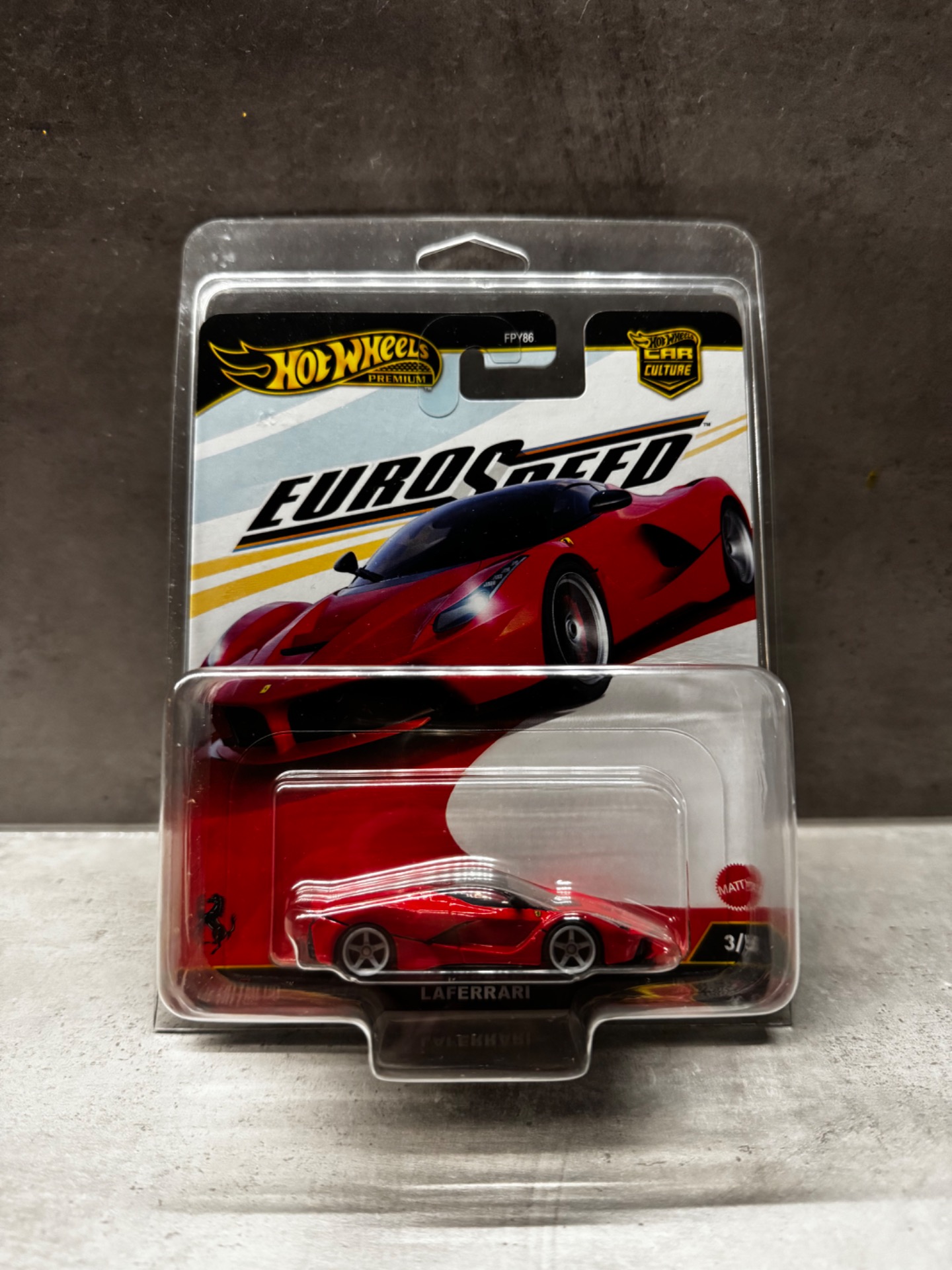 Prémiový model Ferrari LaFerrari ze série Hot Wheels Premium – Euro Speed. Tento ikonický hybridní hypercar značky Ferrari je zpracovaný s důrazem na detail a realistický design.