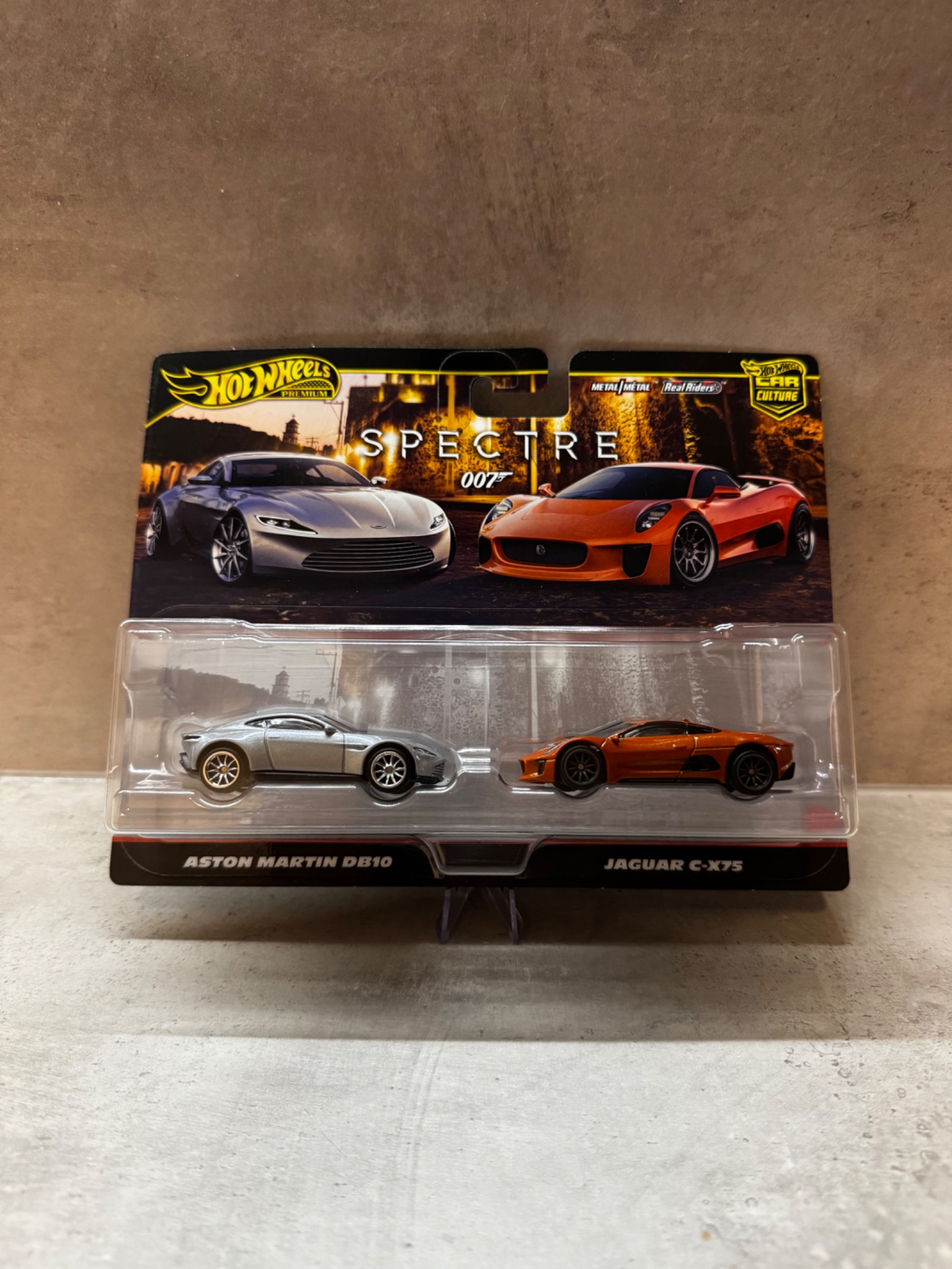 Limitovaný set z edice Hot Wheels Premium Car Culture – Spectre 007, inspirovaný filmem o Jamesi Bondovi. Obsahuje ikonické vozy Aston Martin DB10 a Jaguar C-X75, které se objevily ve filmu Spectre.