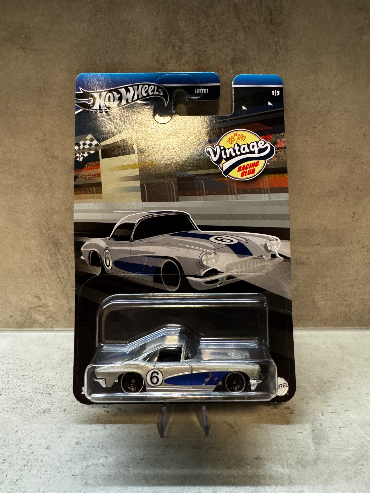 Legendární Corvette z roku 1962 přichází ve stylovém provedení série Vintage Racing Club. Čistý bílý lak, modrý závodní pruh a startovní číslo 6 odkazují na zlatou éru motorsportu.