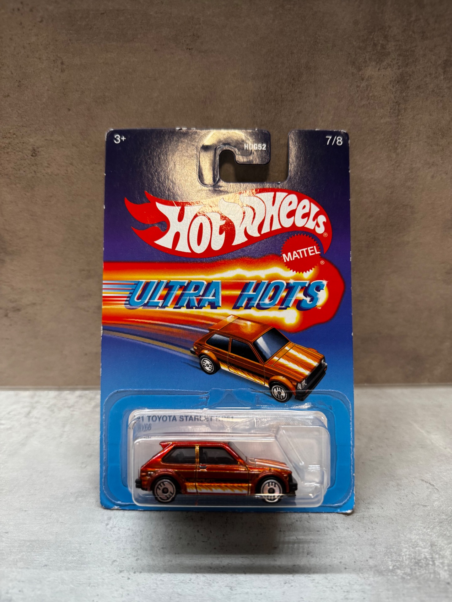 Toyota Starlet ‘81 KP61 z prémiové retro edice Hot Wheels Ultra Hots. Model je vyveden v metalické bronzovo-měděné barvě s jemnými pruhy inspirovanými grafikou 80. let. Auto má speciální Ultra Hots kola a detailní tampoprint karoserie včetně světlometů a bočních linií. Série Ultra Hots navazuje na historické provedení klasických Hot Wheels a je mezi sběrateli oblíbená pro svůj nostalgický vzhled.