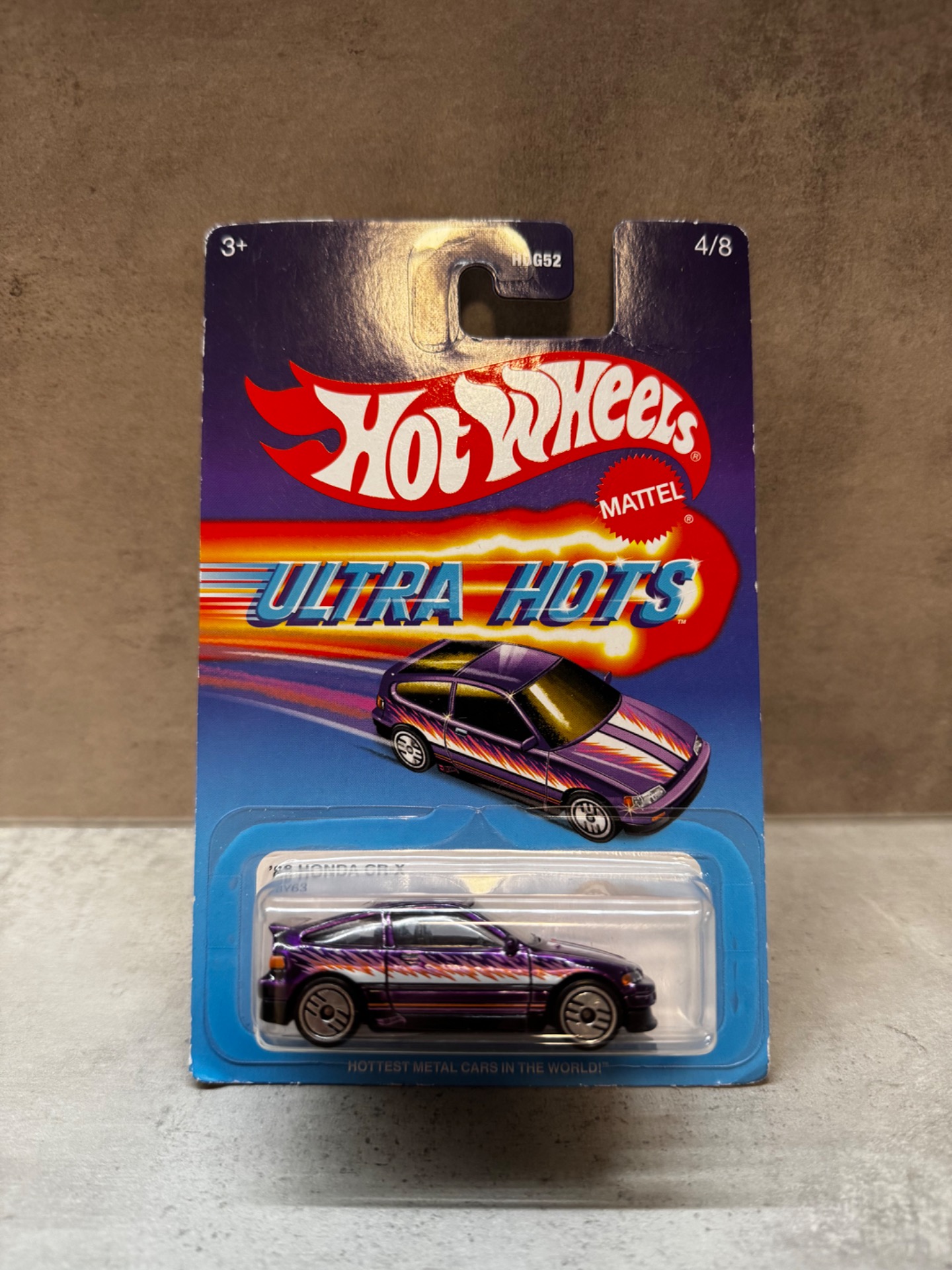 Kultovní návrat klasické série Ultra Hots inspirované stylem 80. a 90. let. Model '88 Honda CR-X přichází v metalickém fialovém laku s retro grafickými pruhy a ikonickými Ultra Hots koly. Díky celokovové konstrukci (metal/metal) a detailnímu zpracování patří tahle edice mezi vyhledávané kousky do vitríny.