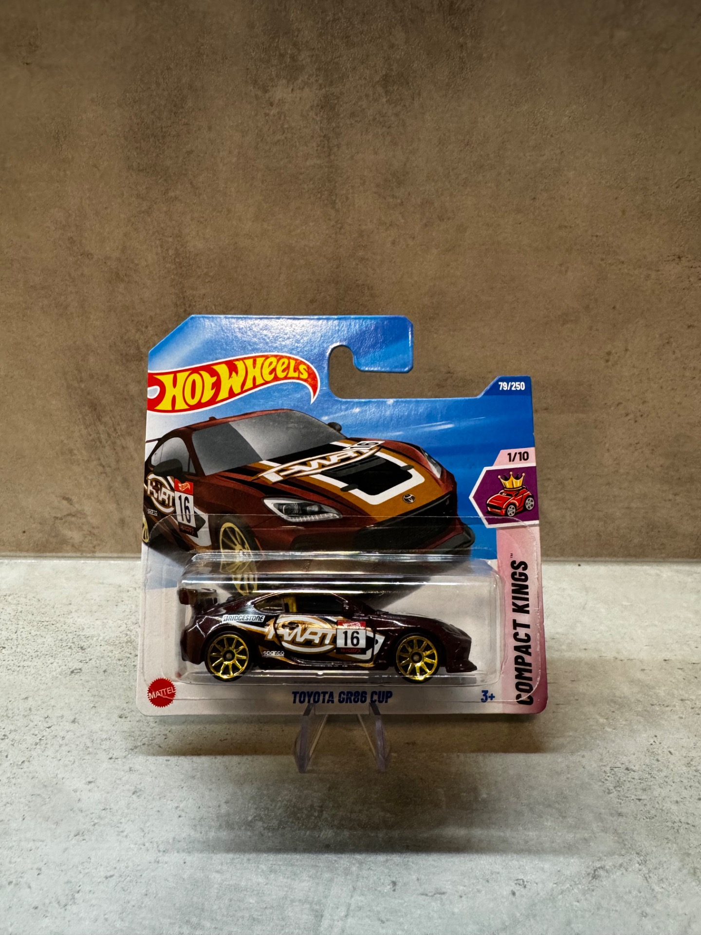 Elegantnější varianta závodní GR86 v tmavě vínovém laku se zlatými koly a detailními polepy. Kombinace barev působí luxusně a sportovně zároveň.