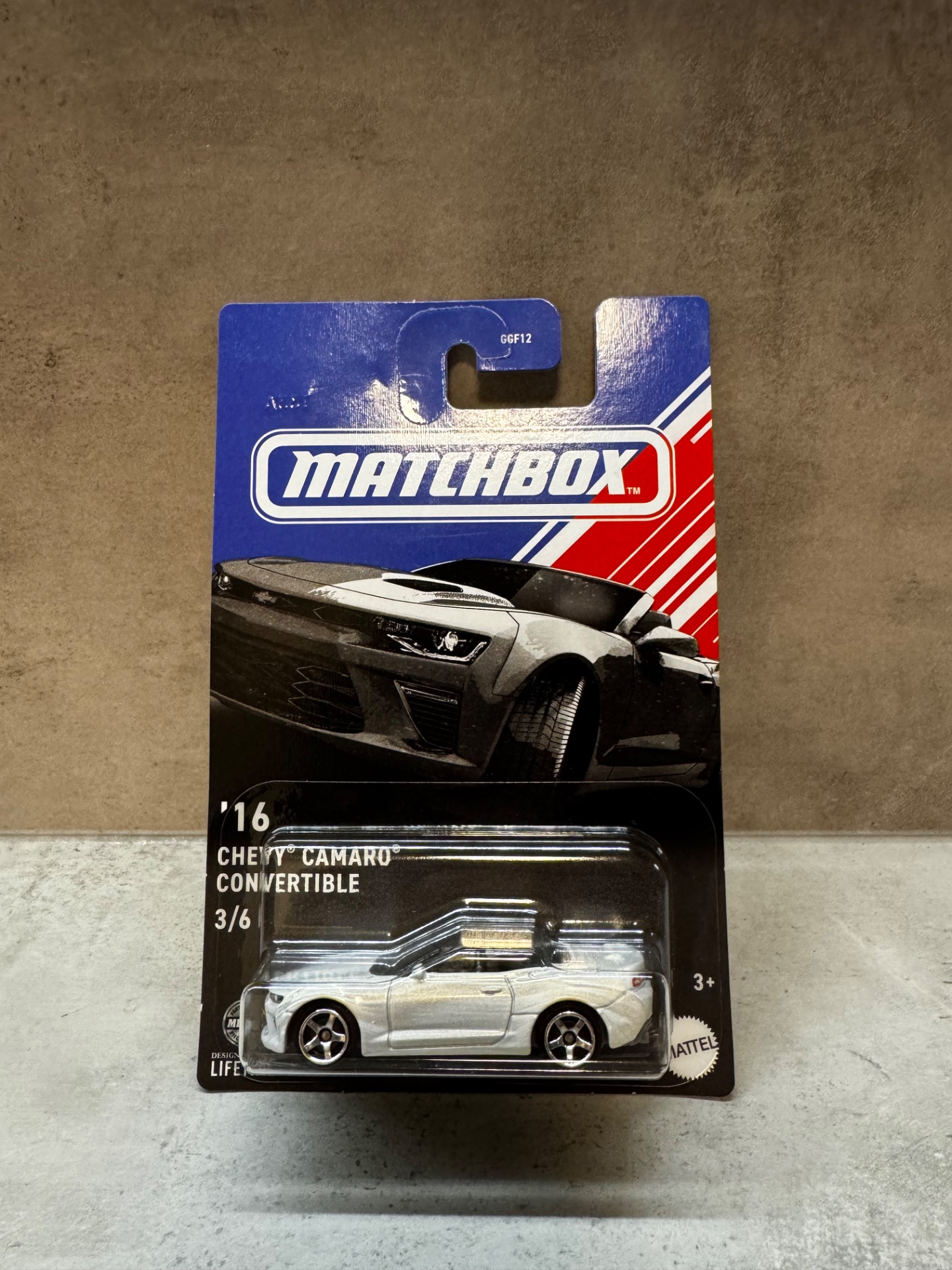 Moderní Chevrolet Camaro Convertible (2016) od Matchboxu. Elegantní kabriolet v realistickém provedení s kovovým tělem. Skvělý model pro fanoušky amerických muscle cars i každodenní sběratelské kolekce Matchbox.